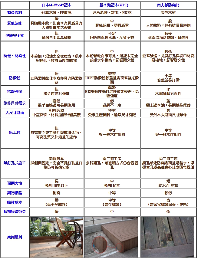M-Wood2是一種以簡單的保養方法就能保持長期耐用的塑木。室外設施因受風雨及長期日曬影響,天然木材必需灌注或塗上防腐劑或其他塗料,常常需要進行維修:即使這樣費心勞力的保養,天然木材最多也只有10年左右的壽命。而M-Wood2卻只要以簡單的保養就可保持長期耐用,無須防腐或是定期上護木漆,減少可觀的維修成本支出,是非常經濟的材料。