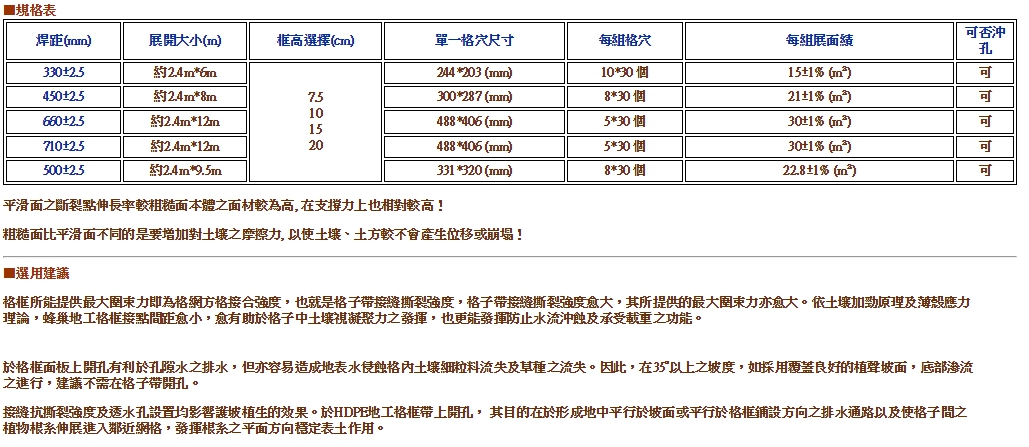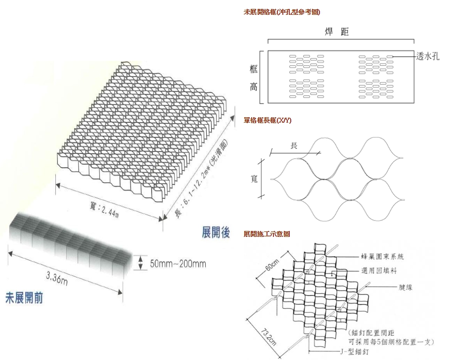 ●施工簡便:蜂巢地工格框為廠製品,具有固定規格,可依設計選用。儲存時呈一條狀,施工時打開舖設成一立體蜂巢構造。施工現場僅需組裝定型,灌充填料,操作簡便,較不受氣候因素的影響。 重量輕,易運輸,容易展開施工,在水中亦可施工使用。