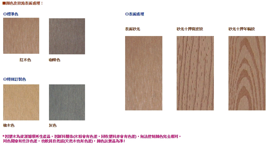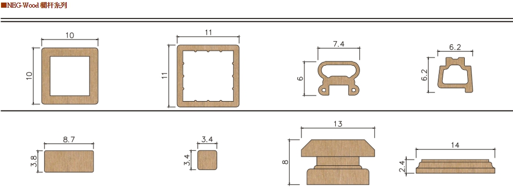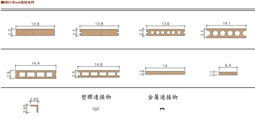 耐格塑木NEG-Wood是用木質纖維或植物纖維填充、增強的改質熱可塑性塑膠,兼有木材和塑料的成本和性能優點,經押出或熱押出成型為異型材、板材或其他產品,可替代木材和塑料。具有不腐蝕、不翹曲、維修方便、外觀與木材非常相似等諸多優點,因此把木粉填充混配料加工成建築和結構用型材已成為目前塑料押出行業中最為活躍的領域之一,以之製成的建築型材市場潛力十分巨大。
