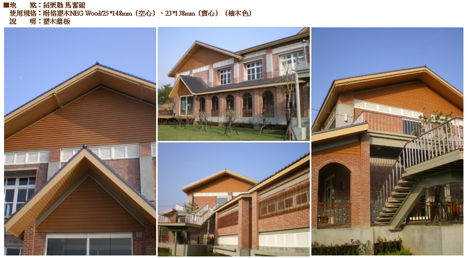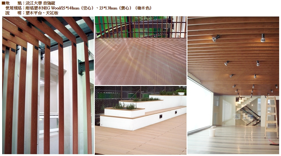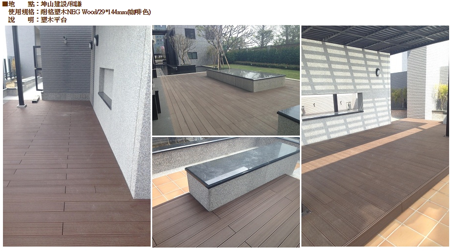 ●耐格塑木NEG-Wood含有塑膠成份,所以能抗禦水及白蟻的侵襲、抗腐蝕、耐潮濕、耐酸鹼。