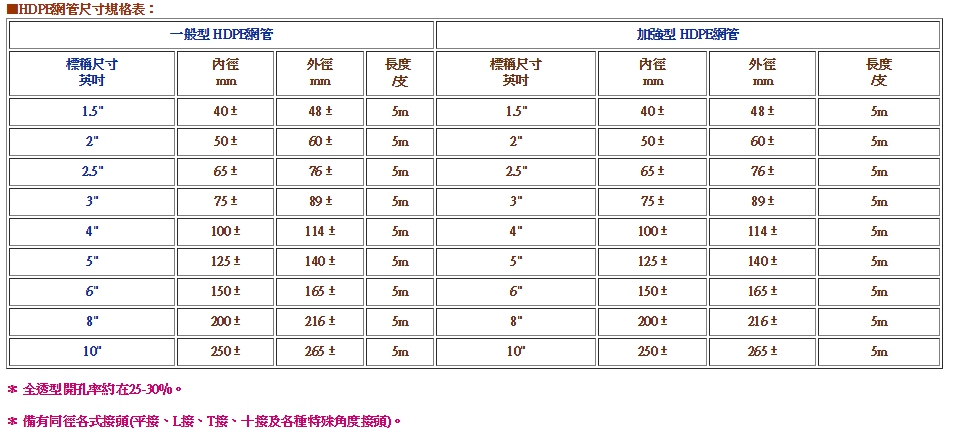網孔均勻,開孔率大,透水性佳;且網孔構造立體,大小適中,可防止土粒雜物阻塞,由網眼滲透之水分,聚流到管底無孔部集水自縱向流出,集流量大。