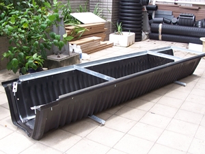 *改良型滲透U型溝,於溝體側面有孔隙配合PP透水材,可降低雨水於溝外側旁流的問題。