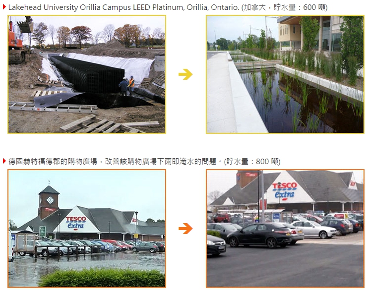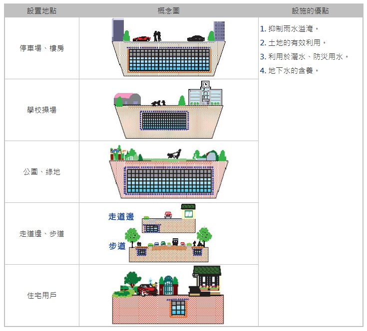 日本於 1983 年開始推廣以碎石作為埋設於地底骨材,並以碎石間空隙作為雨水貯留空間之雨水貯留浸透工法,使雨水得以達到再加已利用並減緩地表逕流作用。日本於 1997 年開始推廣使用雨水積磚,至 2005 年時,雨水積磚工法使用比例已超越混凝土工法,至 2007 年使用雨水積磚工法已是混凝土工法兩倍之多。