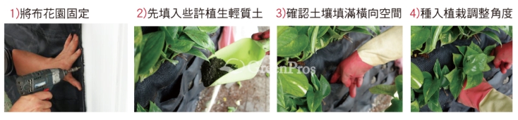 • 布花園植生牆系統整體功能為考量植栽生長環境,採橫向連通式 填土口袋,