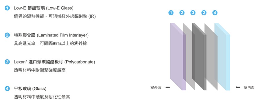 雷明盾 LFE-LE防侵入Low-E節能玻璃,室外面玻璃為Low-E低輻射節能玻璃,不僅有高透光率,且可高效阻隔陽光中所帶來的輻射熱,兼具防盜安全和節能隔熱的雙效功能