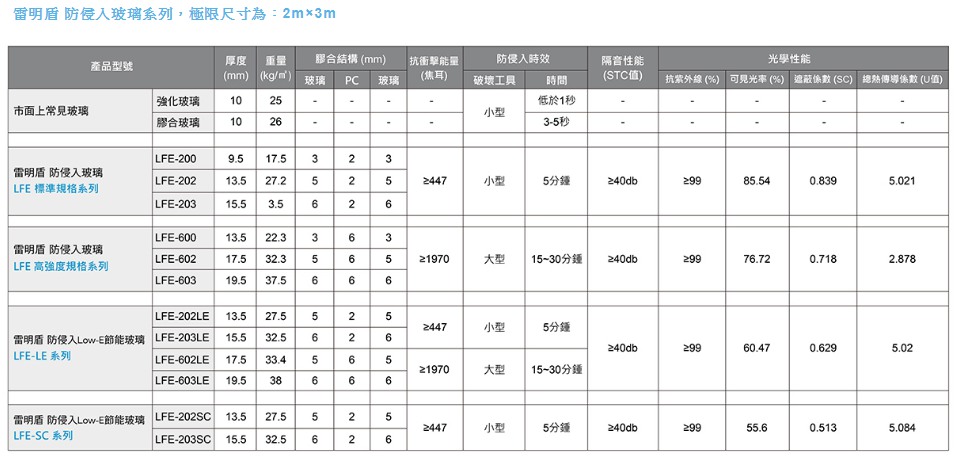 雷明盾 LFE-SC防侵入Low-E節能玻璃,兩片玻璃中間為Lexan* Low-E進口聚碳酸酯板材(Polycarbonate),具有優異的光學和隔熱性能,可高效阻隔陽光中所帶來的輻射熱,對環境友善,可降低空調消耗並大幅節省能源。雷明盾 LFE-SC 防侵入Low-E節能玻璃,遮蔽係數SC值約0.51,日光熱輻射取得率SHGC值約0.44,遠低於其他的Low-E玻璃,兼具防盜安全和節能隔熱的雙效功能。