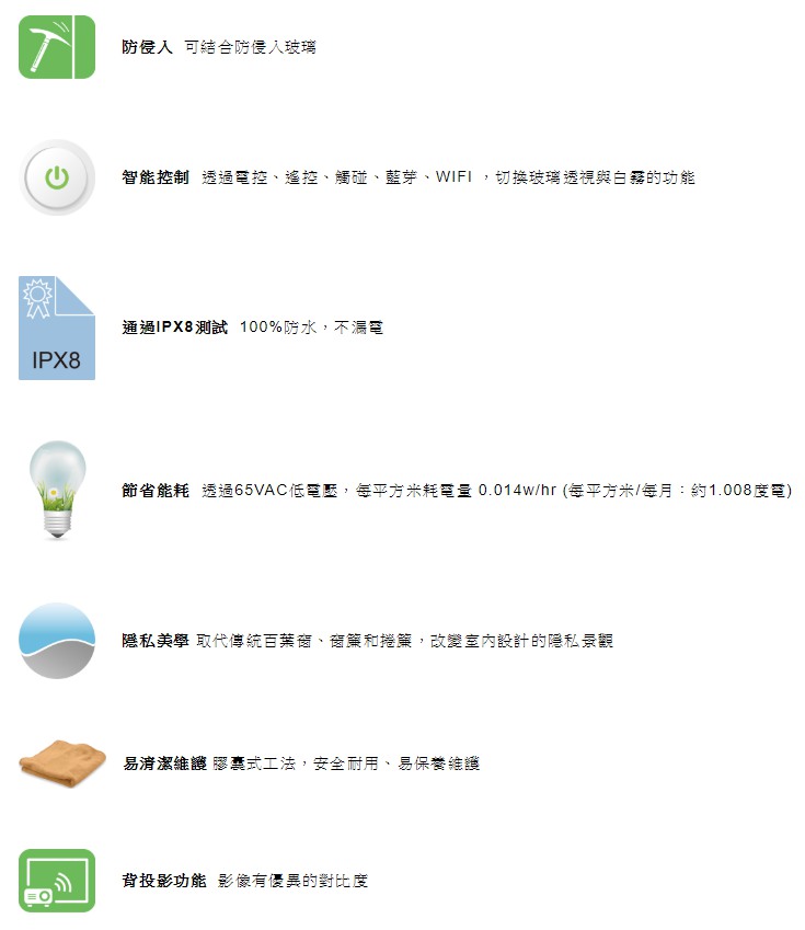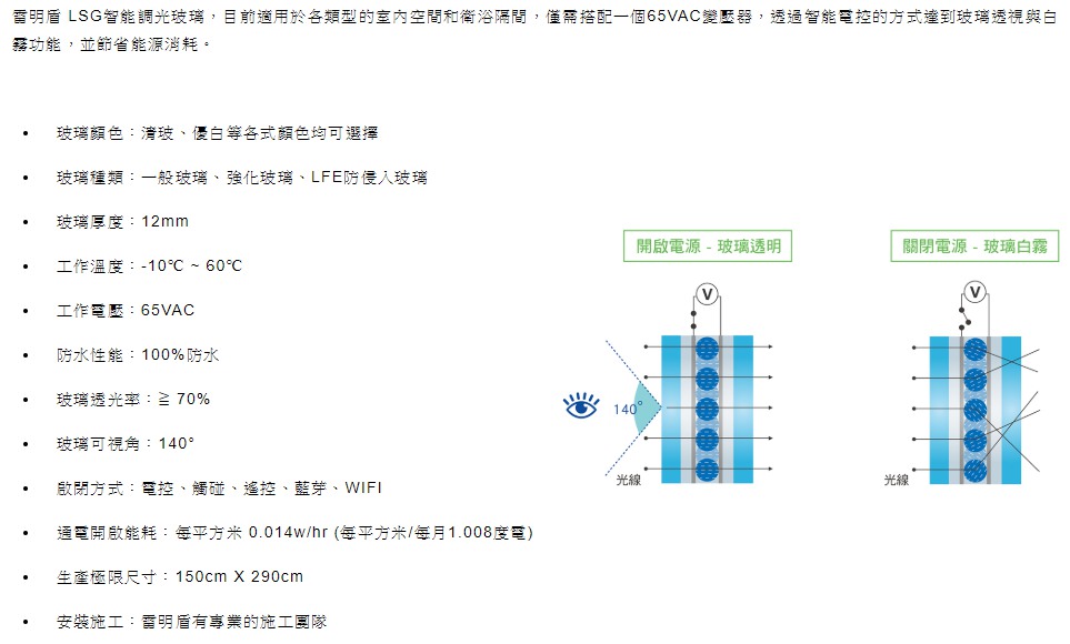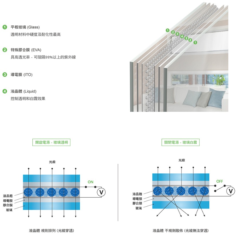 雷明盾 LSG智能調光玻璃,即兩片玻璃將光學液晶體與導電膜採膠囊式工法膠合製程,透過智能電控的方式,切換玻璃透明通透與白霧遮蔽的功能,達到隱私空間和智能科技兼具的效果,除了有更舒適的生活環境,且可大幅節省能源消耗,是綠建築中不可或缺的建築材料。