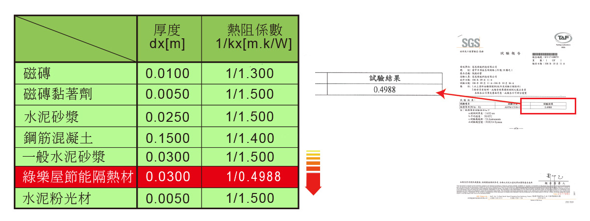 本產品經由台灣檢驗科技SGS.ASTM C518-15熱傳導率檢驗為0.4988(W/m.K),能有效降低溫度,可節能、抗寒,以符合國家綠建築節能外牆需求。