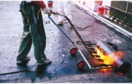 5,將假鋪設的防水毯校正完成後重新捲回,再依序使用火焰槍仔細燒黏。在施工時要特別注意避免火焰直接燒到表面層破壞其美觀性