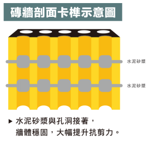 輕質隔間磚體特殊的垂直通孔設計,施工時水泥砂漿被磚體擠壓後微滲入通孔,形成一個一個鉚釘卡榫,就像在牆內釘上無數根水泥釘子,緊緊互扣,使牆體具有優異的抗剪抗裂能力,大大減少居家維護成本與煩惱。