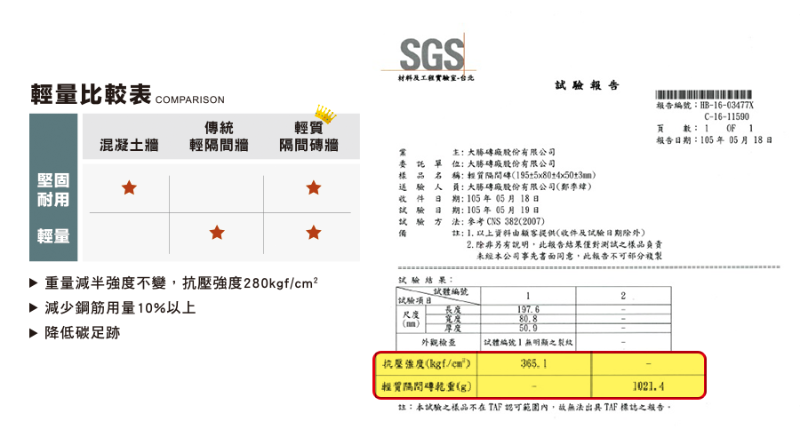 輕量化的重量,減少震動慣性,經國家地震工程研究中心實驗證明,8公分的輕質隔間磚牆體,能承受1G的震度,相當於10級強震,遠高於國家法規建築規範7級0.4G的要求,提升居家安全保障。 輕質隔間磚本身有280kgf/cm2以上之抗壓強度,相當於4000磅混凝土,可做承重牆,在地震發生時,可分擔主結構的支撐力,增加建物耐震性。 (地震實驗報告,強調受試體長寬&厚度&三軸G力)