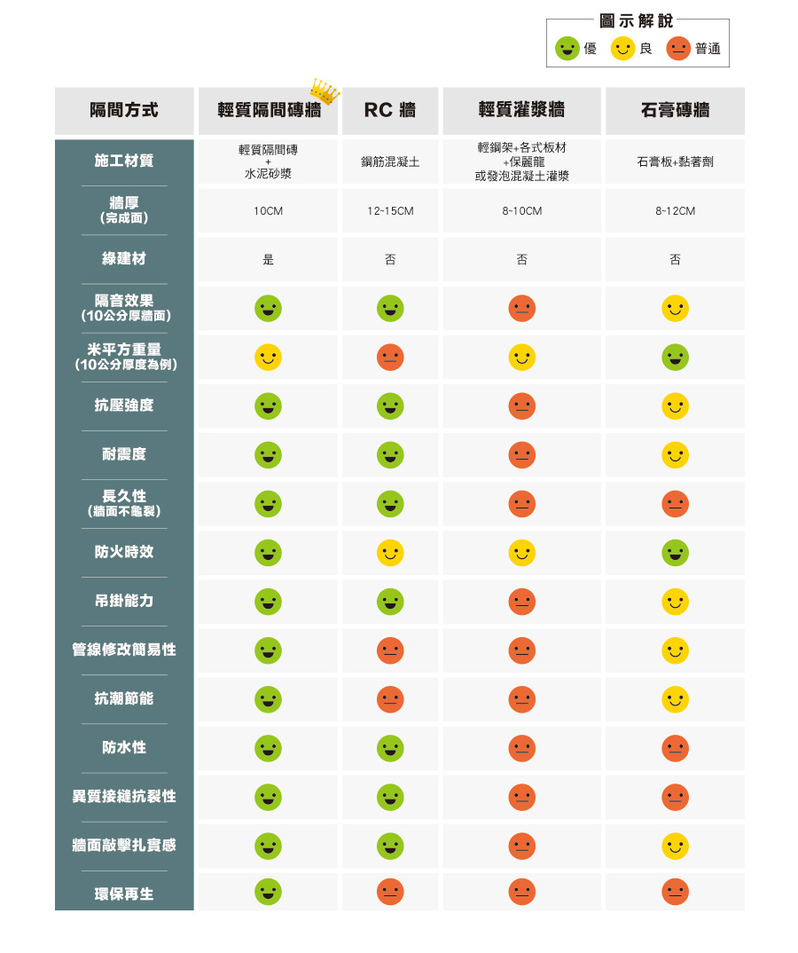 輕質隔間磚為輕量化隔間分戶牆體材料,由經濟部工業局委託工研院材化所博士輔導設計、台灣製造、專利製程,針對台灣多震帶的地質、潮濕高溫的氣候、住宅密集的特性,開發出輕質隔間磚,不僅融合創新思維與各種隔間建材的優點,更符合現代化、都市化、節能化的建築潮流。