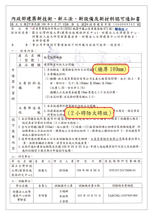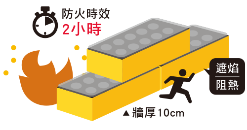 10CM牆厚之輕質隔間磚牆取得國家認證防火時效2小時,具遮焰阻熱性,給予住戶超越法規規範的居家安全。