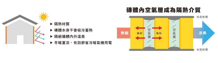 輕質隔間磚牆體本身特性不吸冷不蓄熱。 地表最強的天然隔熱素材為空氣層,輕質隔間磚牆內無數空氣柱形成最佳隔溫屏障,有效節省冷暖氣機用電,環保節能,省錢又健康。
