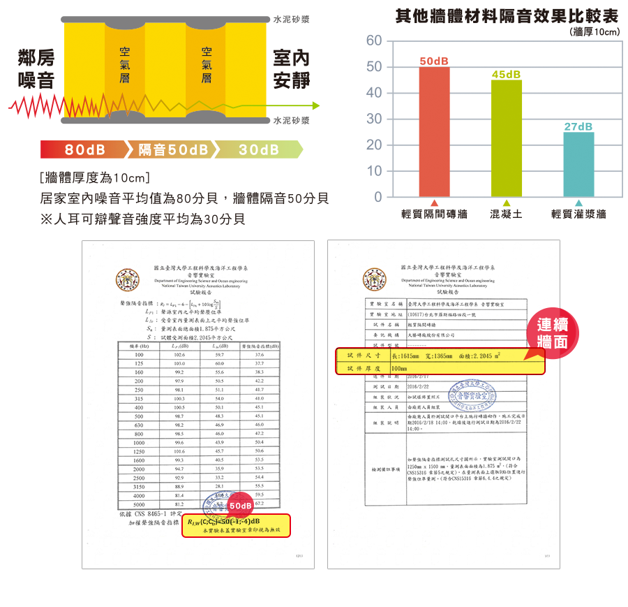 台大音響實驗室證明,10公分厚之牆體,具有50分貝隔音降噪效果,隔音品質效果恆久。