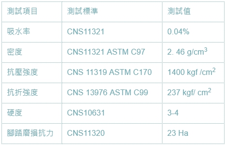 彌補天然石材的色澤不均的缺點。色澤均勻、紋路對稱、搭配較具整體性,適用場合廣泛,為人性化環保建材。