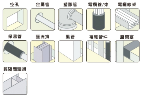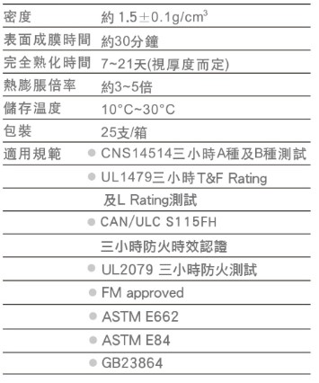 本產品是以水基性壓克力為主成分的防火填縫劑,適用於隔間接縫及多種貫穿結構的縫隙作為防火密封材料,具有三小時的防火時效。同時,暴露於超過暴露於超過1×106Gy(1×108rad)中子及伽馬輻射單位下,仍能保持正常防火功能。