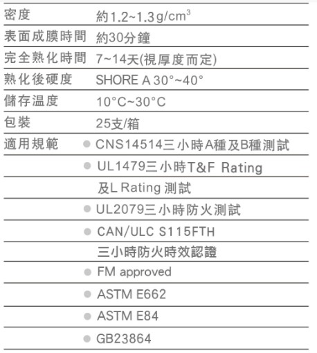 本產品是中性矽質(Silicone)單劑型的防火填縫膠,適用於隔間接縫及多種貫穿結構的縫隙作為防火密封材料,火災時可阻隔火焰、濃煙、有毒氣體的穿過,具有三小時的防火時效。同時,暴露於超過暴露於超過1×106Gy(1×108rad)中子及伽馬輻射單位下,仍能保持正常防火功能