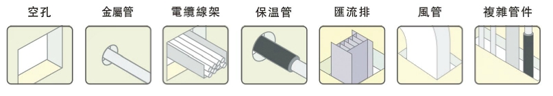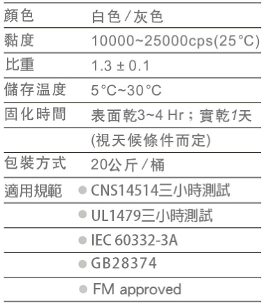 本防火塗料,經適當塗佈量施工(乾膜厚度至少0.4mm),可通過IEC332-3A測試認證;若與工法搭配,可應用於貫穿結構之截火系統,通過CNS14514 / UL 1479三小時測試認證。