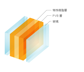 高性能隔音膜:是由三層構造合成,中間層使用具良好隔音效果之特殊樹脂層,兩側外表層則是使用高評價的PVB樹脂。