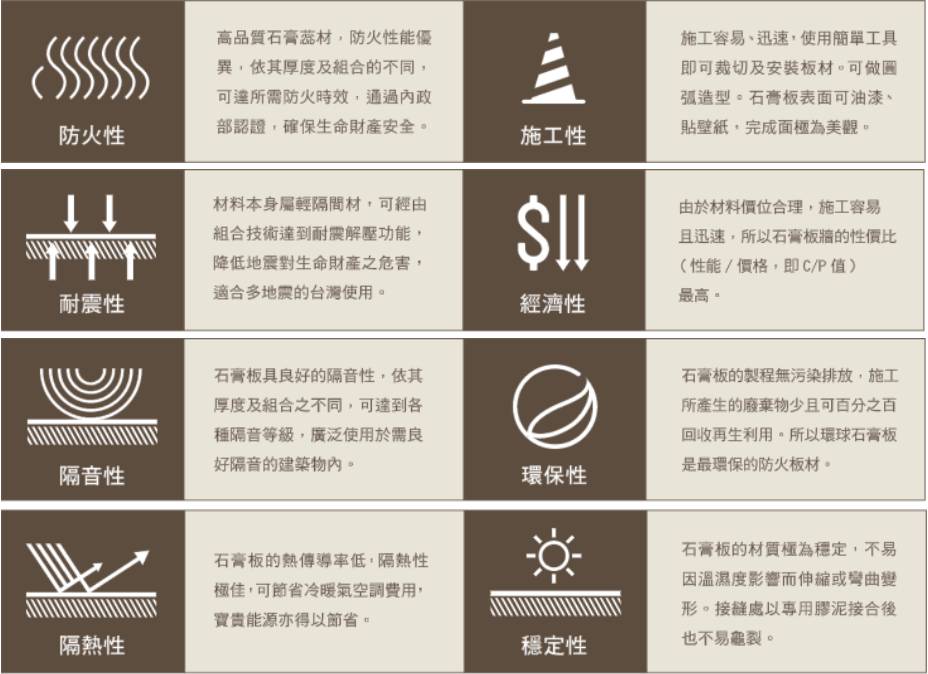 環球石膏板組合之「環球防火系統」是性能優異、施工快速、造價經濟的建築防火系統,其中包含室內分間牆、外牆、明架天花板、暗架天花板、屋頂及樑柱防火被覆系統。