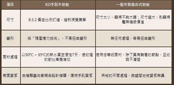 木地板尺寸太小,顯得不夠大器;尺寸過大,則顯得毫無精緻價值,而且失去地板的視覺美感。KD產品皆經視覺藝術大師認可,寬度18cm、長度180cm,堅持打造出木地板中的黃金比例。