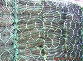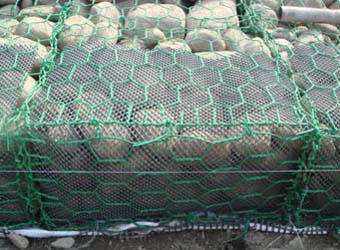 綠化消能石籠係為於石籠臨水正面內側置放綠化消能網材料,可以抑制及消減水流能量及植生綠化之效果,綠化消能網材質為高密度聚乙烯添加抗紫外線添加劑之立體網狀結構,具有一定足夠之厚度及開孔尺寸,且為縱橫斜向交錯肋骨條狀結構。施工完成後初期功能為抑制及消減水流能量,中期功能為挑流淤沙,後期功能為植生綠化,以達到近自然生態工法之目的。