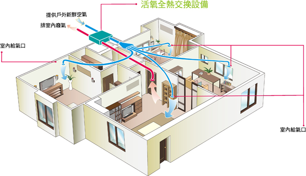 全熱交換器引進戶外新鮮空氣,排出室內汙濁與有毒的揮發性物質,改善室內空氣的品質,讓您在密閉室內全方位享受新鮮空氣,每次的呼吸都清新自然。