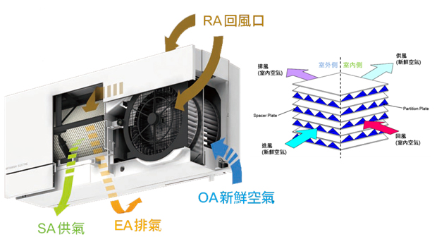 其實全熱交換機可以與冷氣相輔相成,透過能源回收使引入室外新鮮空氣更接近原有空調狀態下的室內空氣條件,因而降低空調設備的負擔而達到節能省電的目的。目前,三菱全熱交換機的能源回收率可高達85%,為目前業界最高!