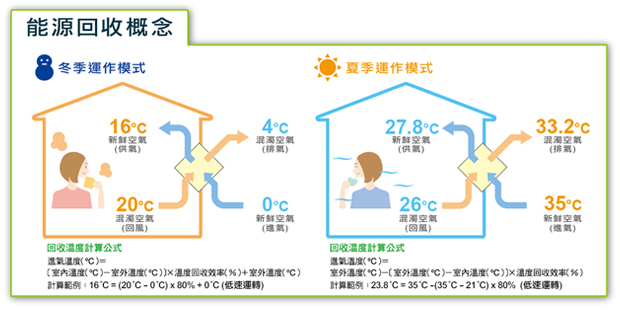 下圖為能源回收說明:若室外空氣為35度,則經過全熱交換機,將溫度調節為27.8度,若冷氣機的溫度設定在26度,則冷氣機的運作在全熱交換機的輔助下,只需降1.8度,因此可以達到節能省電效果。